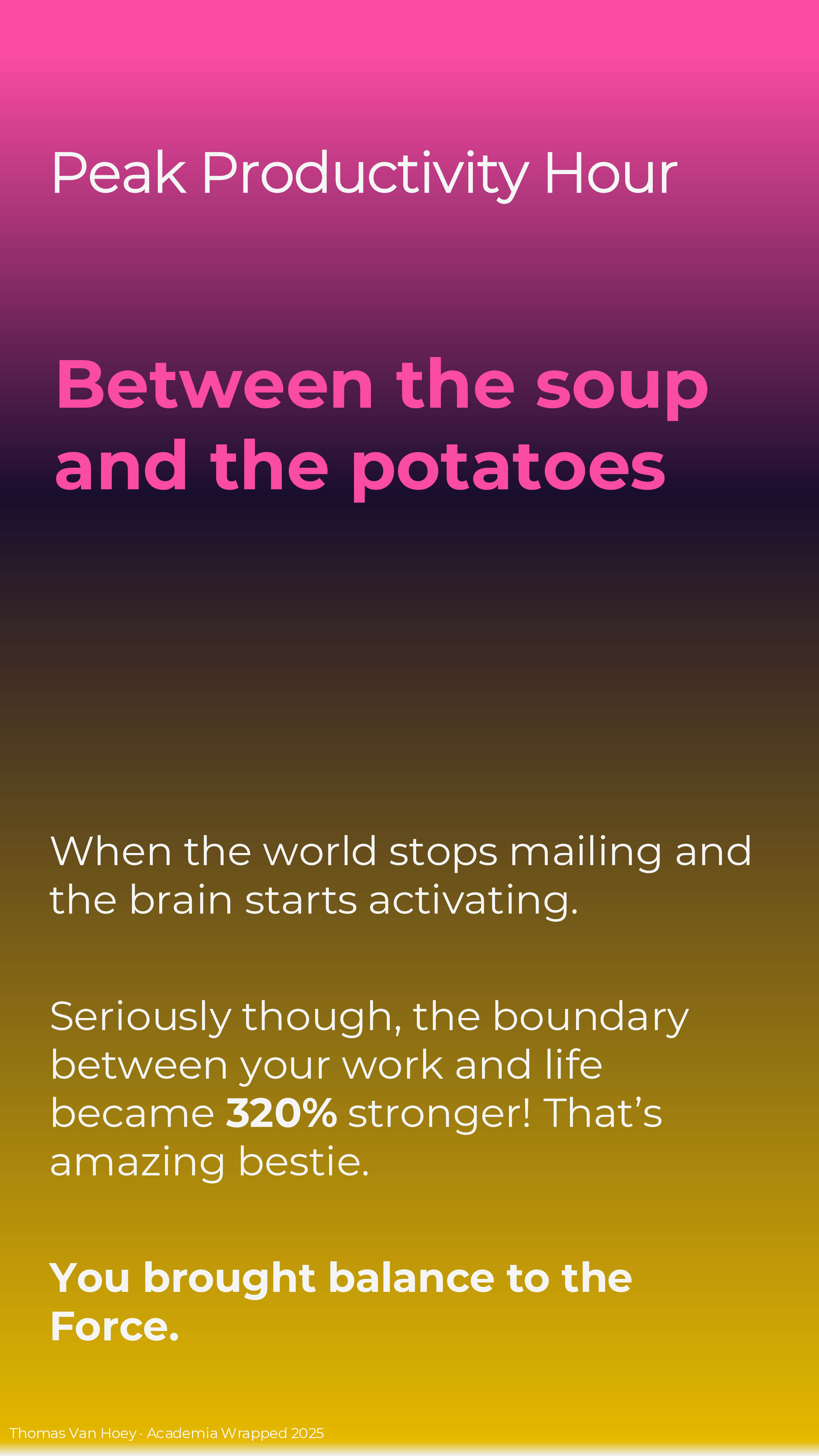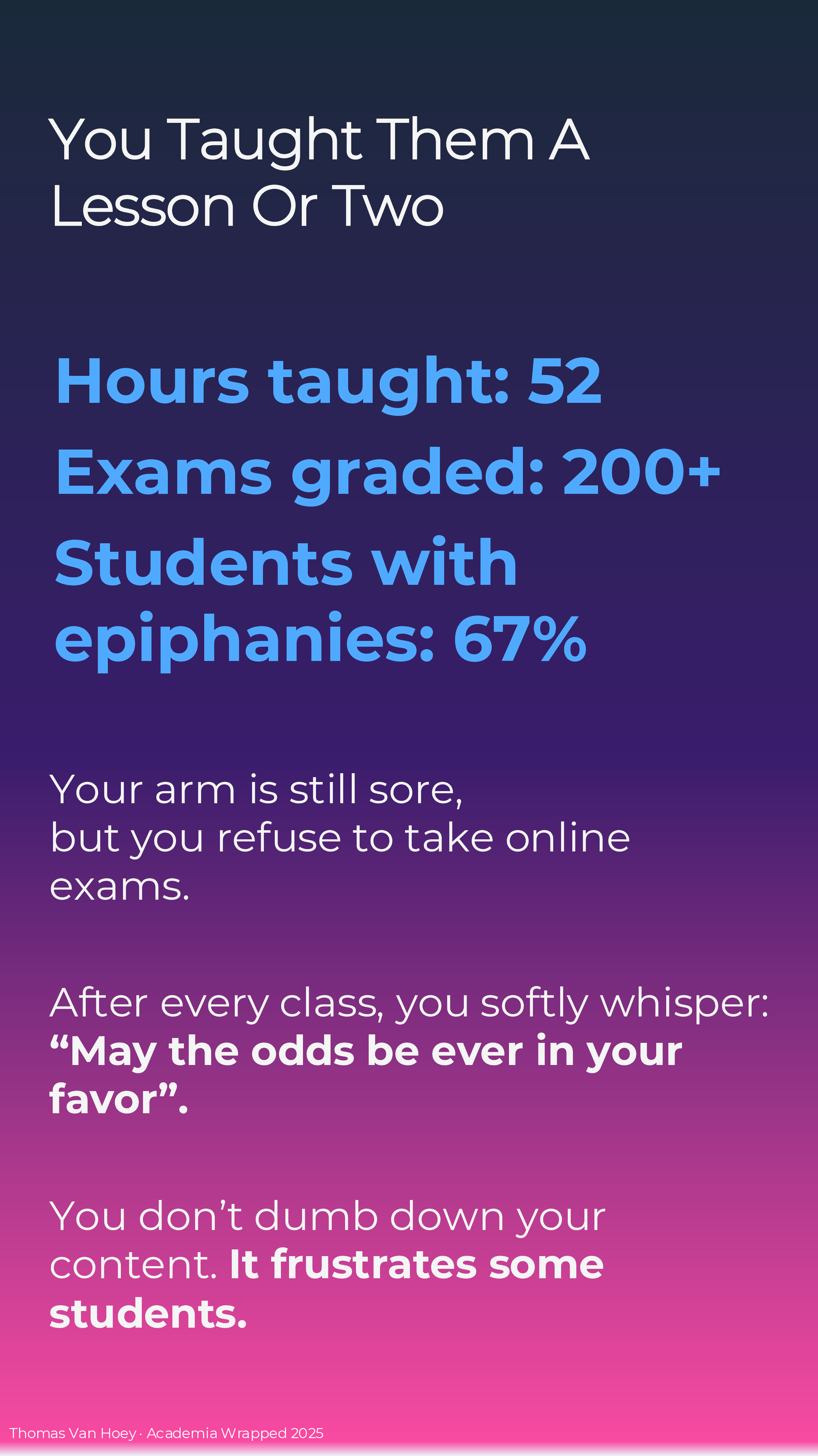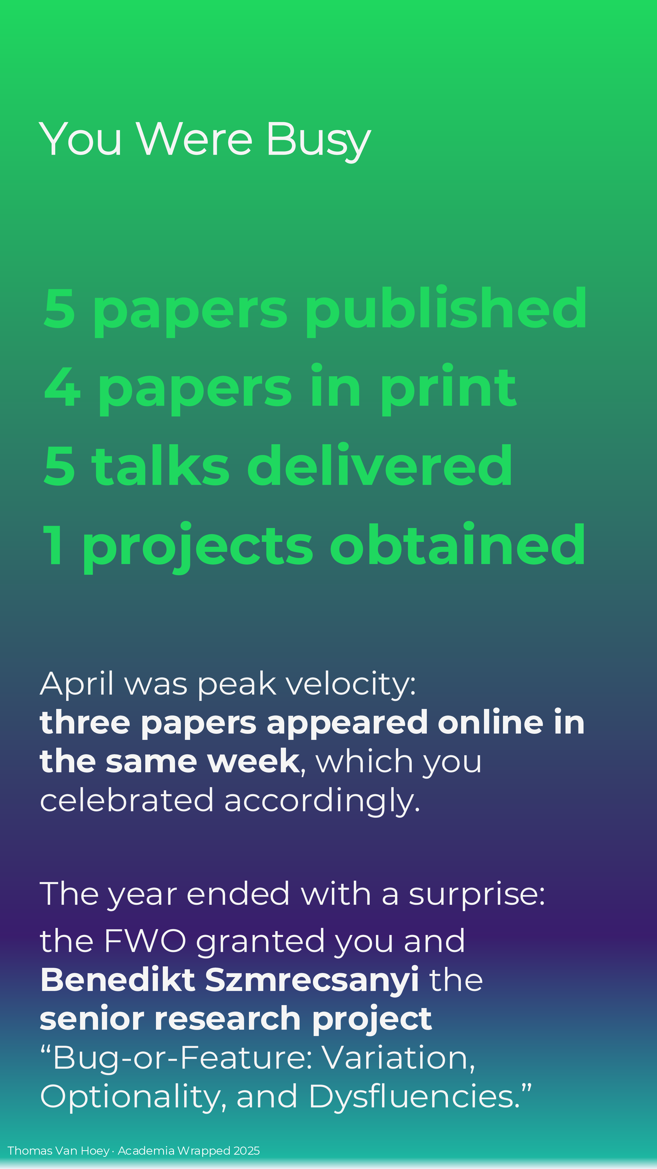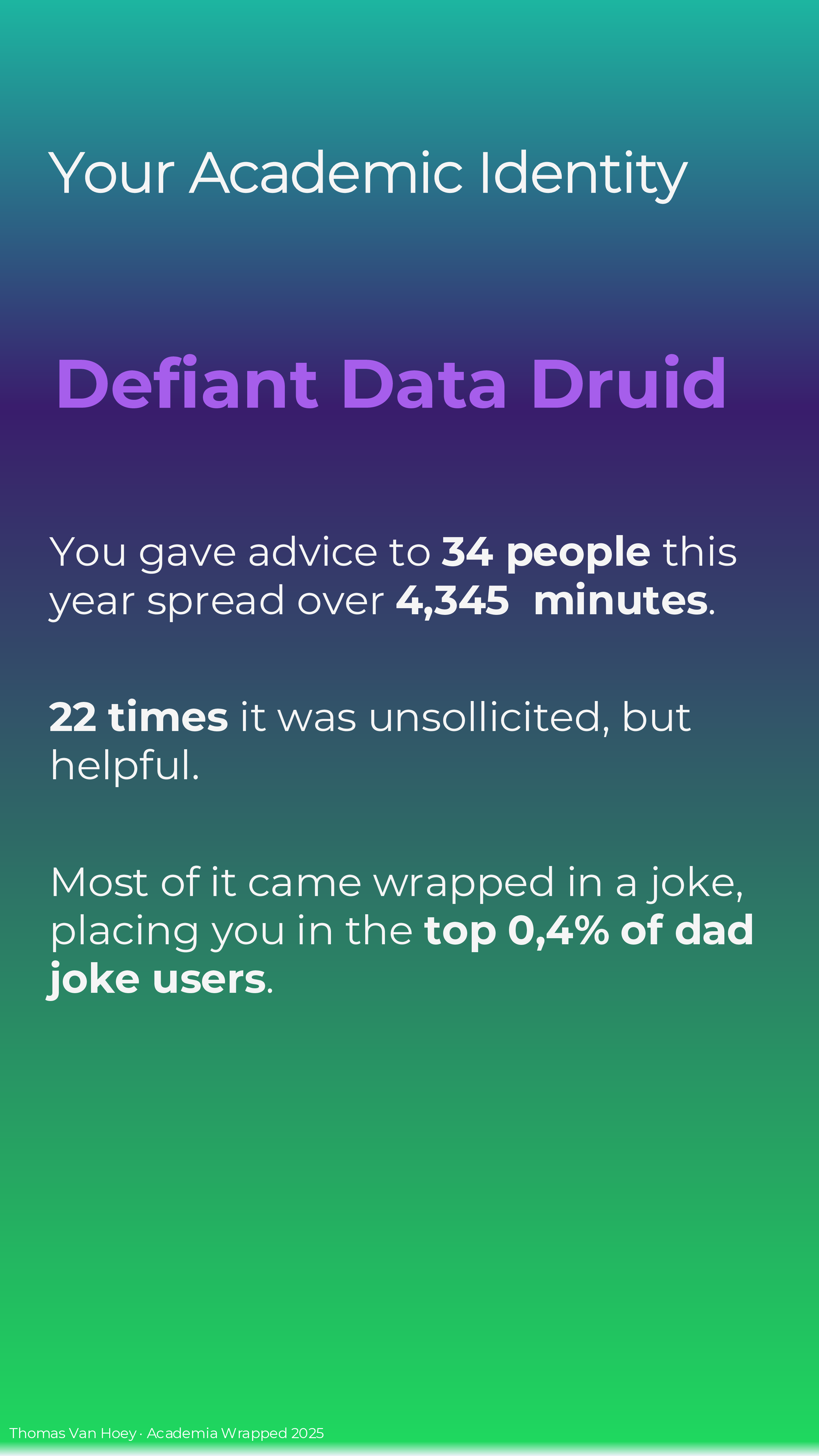 If you too make your own Academia Wrapped 2025 (or if you’re reading this later), I just made it in MS Powerpoint. Contact me if you want the slides, but I want to see your wrapped in return! But please, do not contact me with some AI-generated emoji-ridden Linked-in “summary”. We’re all adults: we can spend the effort to make a good product or leave in the realm of possibilities. In the words of the Korean philosophers ENHYPHEN:
